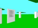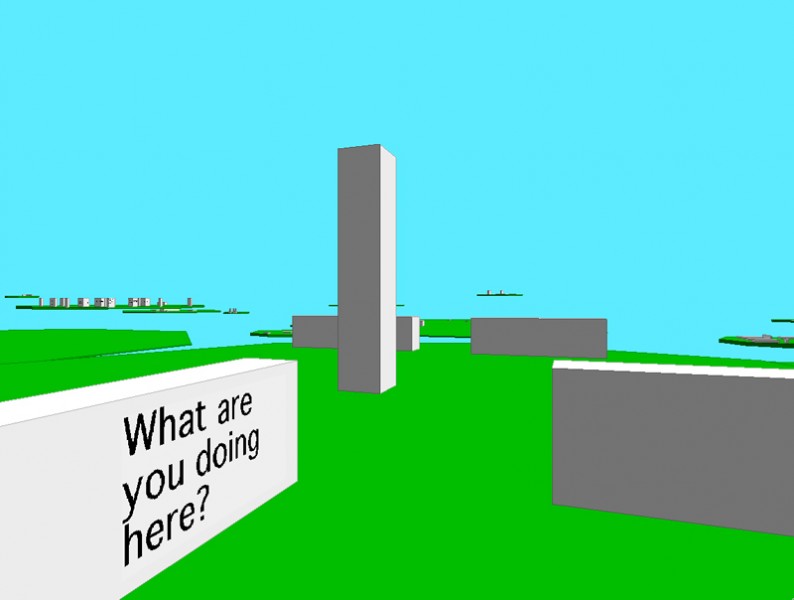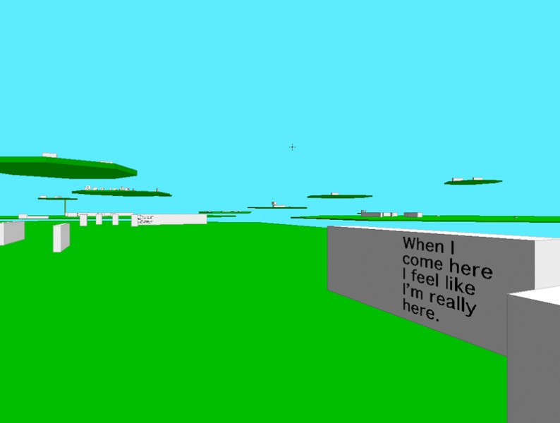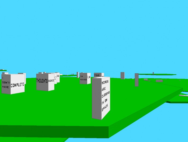 This is a participatory artwork, utilizing the calm stillness of Zen to create a gateway into the virtual experience. The real life space, contained within the square mesh, welcomes you as well as supports you through the virtual experience. Once you are seated and Paul has coached you, like the Zen master, on the controls, you begin the exploration. The first thing you see are three dimensional green lillypad-like extrusions floating on a cyan background. Zooming into these stark structures, you notice gray tombstone-like obelisks on them. Further navigation towards these obelisks reveals simple words and phrases on their surfaces. As you stop and look around these spaces, you begin to notice words combining into more complex thoughts as different obelisks line up in 3 dimensional space. While shifting around these cubes, the combinations change; some disappear, some emerge, positions are altered, and you begin to realize the delightful complexity of this experience.