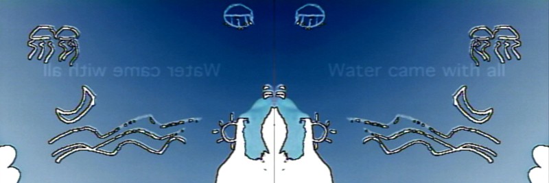 The technical processes of the “matte generator” and “downstream key ” (or DSK), are a means of producing a flat solid-color output which is often used to superimpose or “key” text on top of a video image. In this case what is being written over the video is not text itself but something with visually similar qualities.